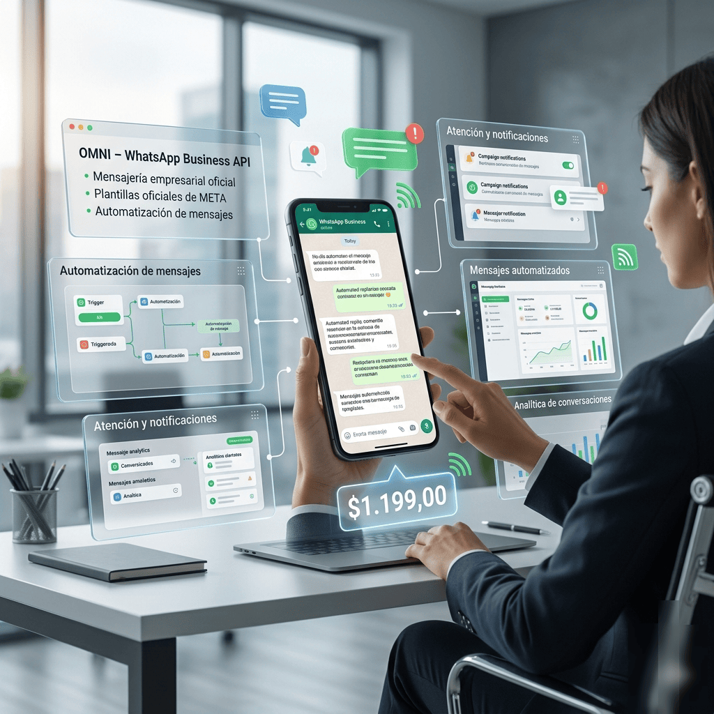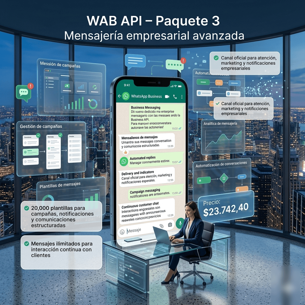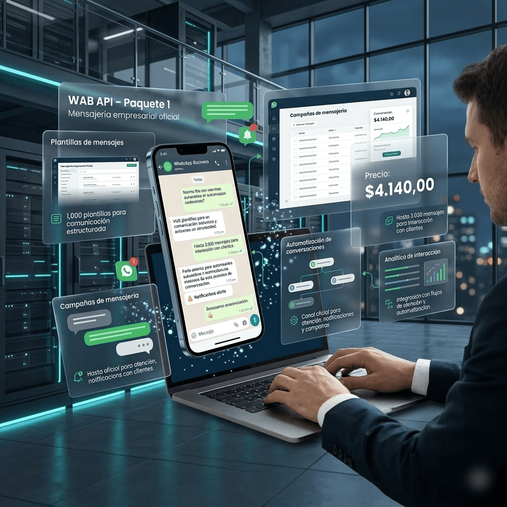 Implemente comunicación empresarial mediante WhatsApp Business API, con un paquete diseñado para gestionar conversaciones, notificaciones y campañas de mensajería de forma eficiente y escalable.